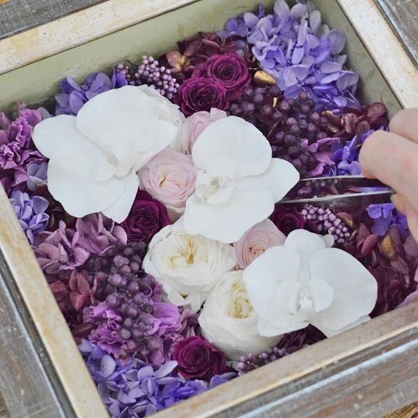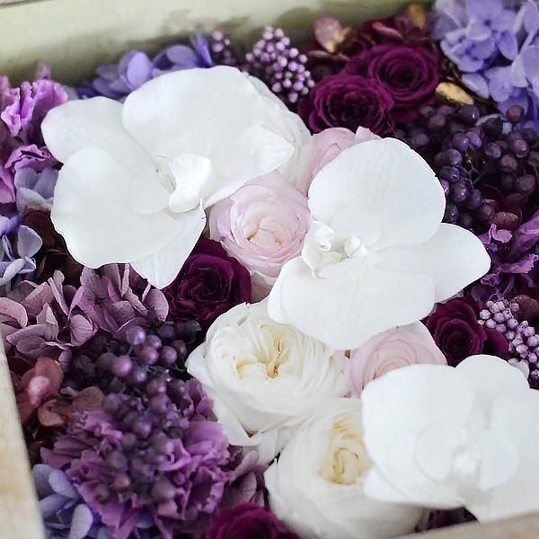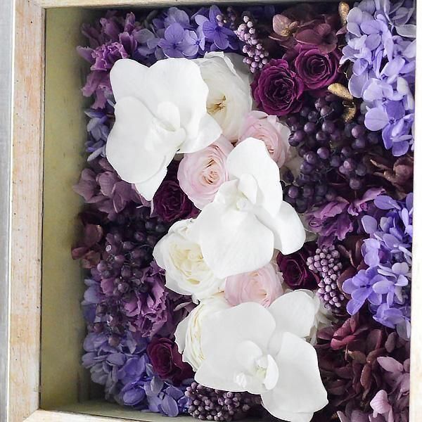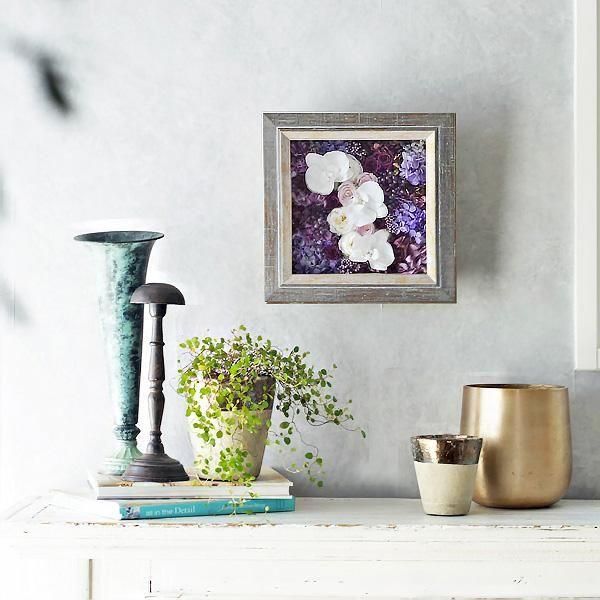 アンティーク加工が施されたフレームの中に、紫陽花やカーネーション、ペッパーベリーなどパープルのグラデーションに、純白の胡蝶蘭を合わせました。