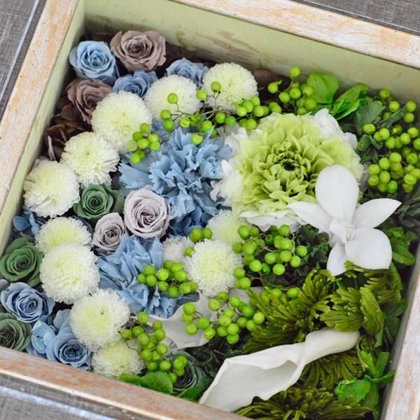 透明の蓋がついた30cm四方の白いお箱に入れて、お届けいたします。