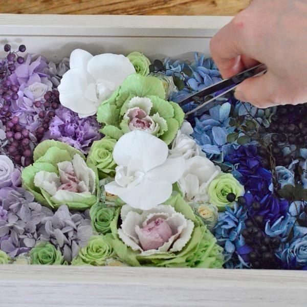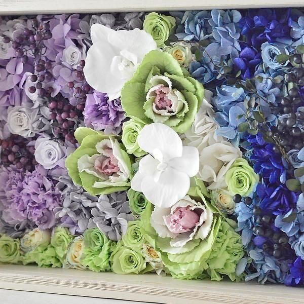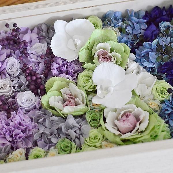 ■花材:葉牡丹・胡蝶蘭・ミニバラ6種・カーネーション3種・アジサイ6種・ペッパーベリー2種(プリザーブドフラワー)